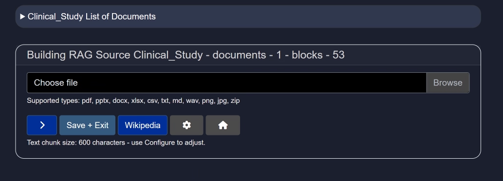 Once the initial group of files are uploaded, you can add more files to the source by selecting + Add Docs. You are also able to add sources from Wikipedia to the RAG source by selecting Wikipedia and typing in the retrieval topic. This feature also allows you to add the number of articles you select (up to 10) from Wikipedia that may be pertinent to your topic.