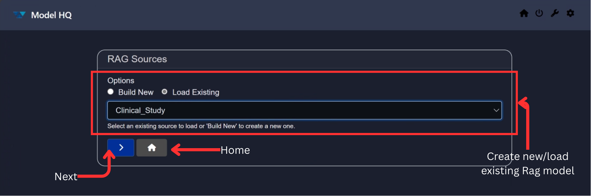 To load an existing RAG source, select the load existing option and click >, and then: