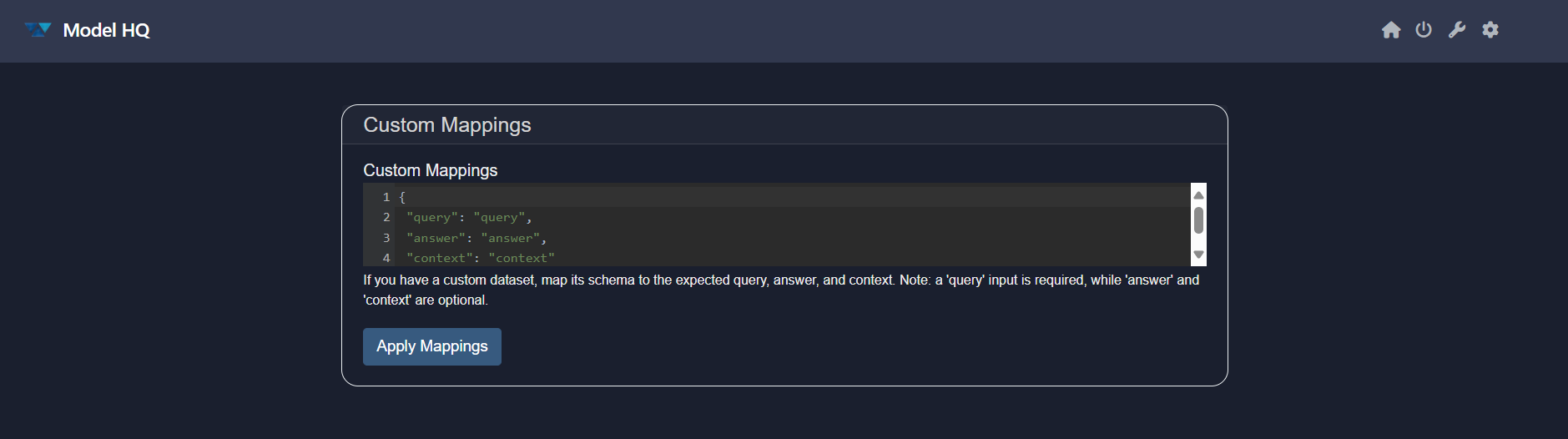 Example:{ "query": "What is the capital of France?", "answer": "Paris", "context": "France is a country in Europe." } - The Mapper tool allows you to align your dataset schema with Model HQ's expected format.