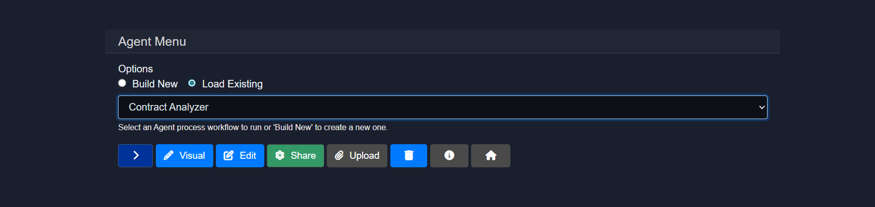 - Load Existing: Loads an existing agent, either a pre-created template included in Model HQ or one previously built by the user.