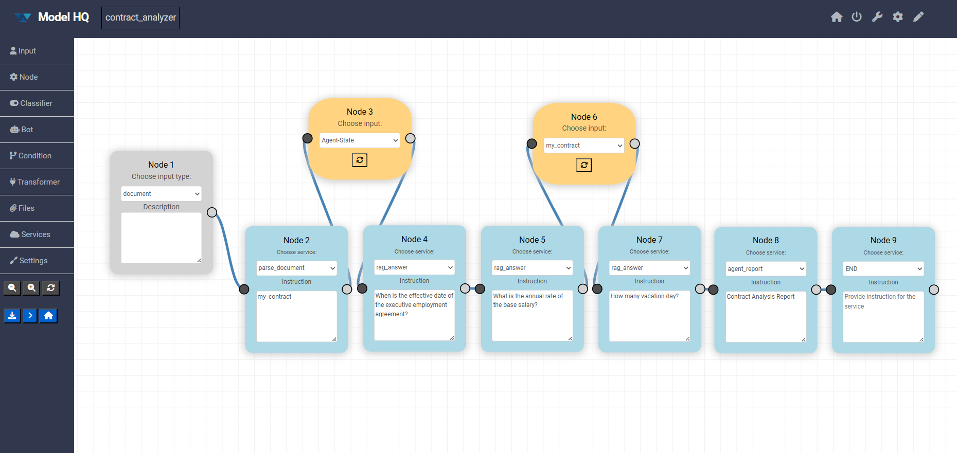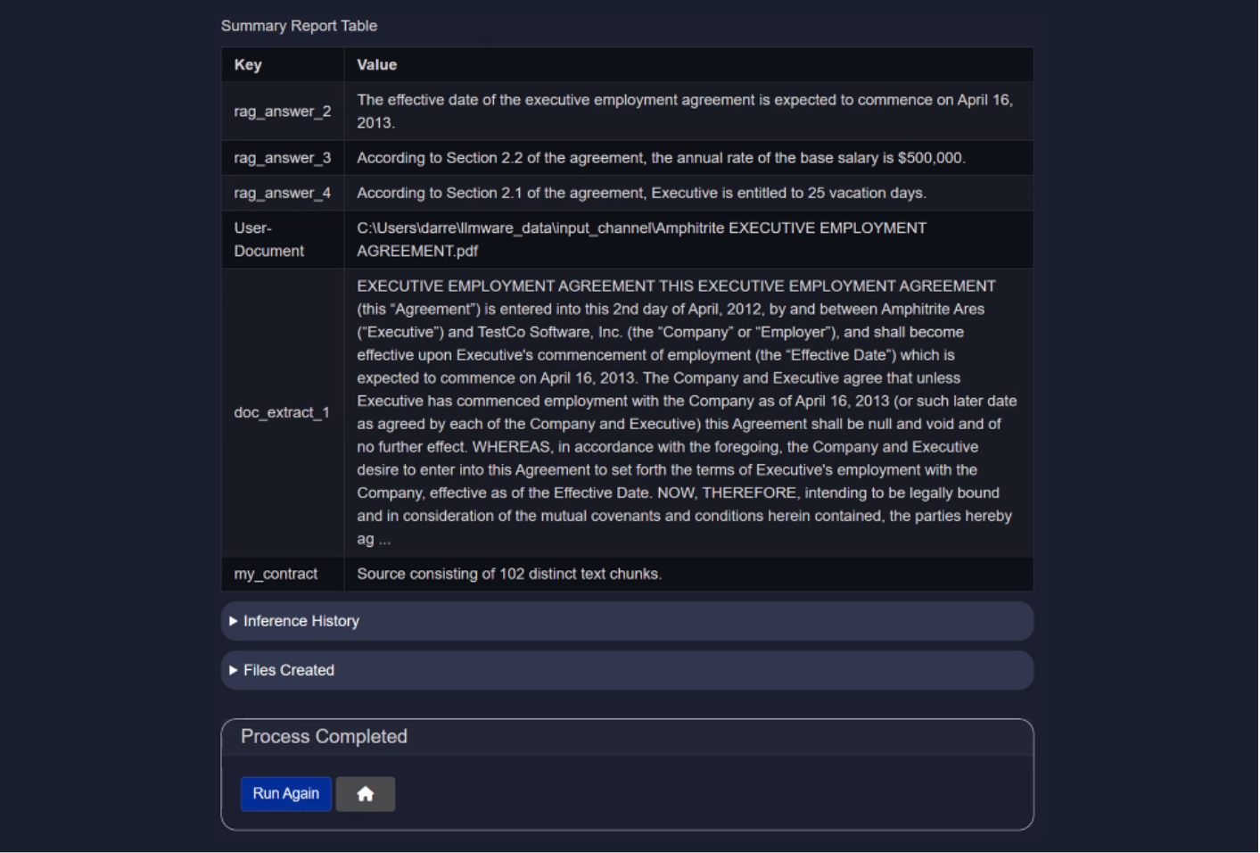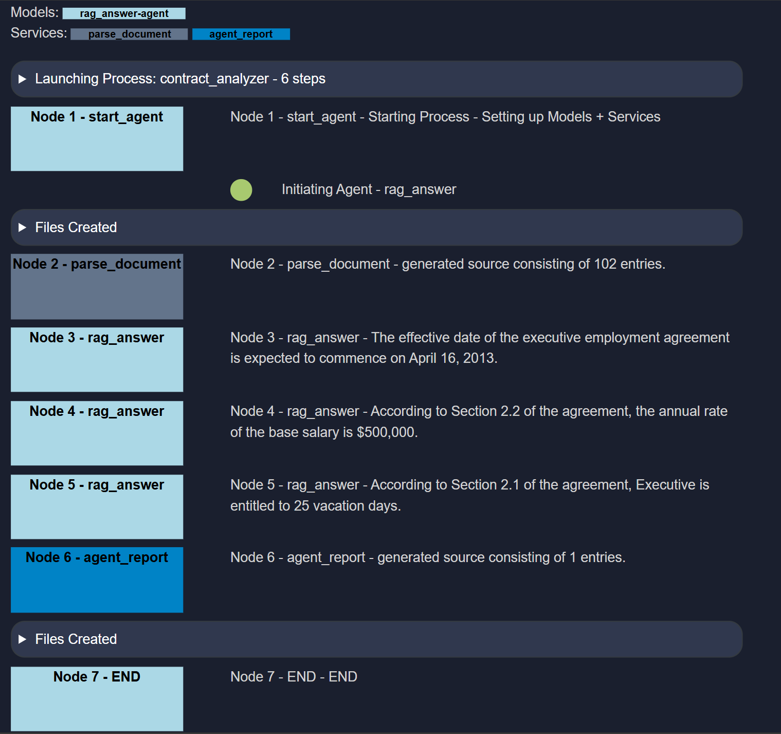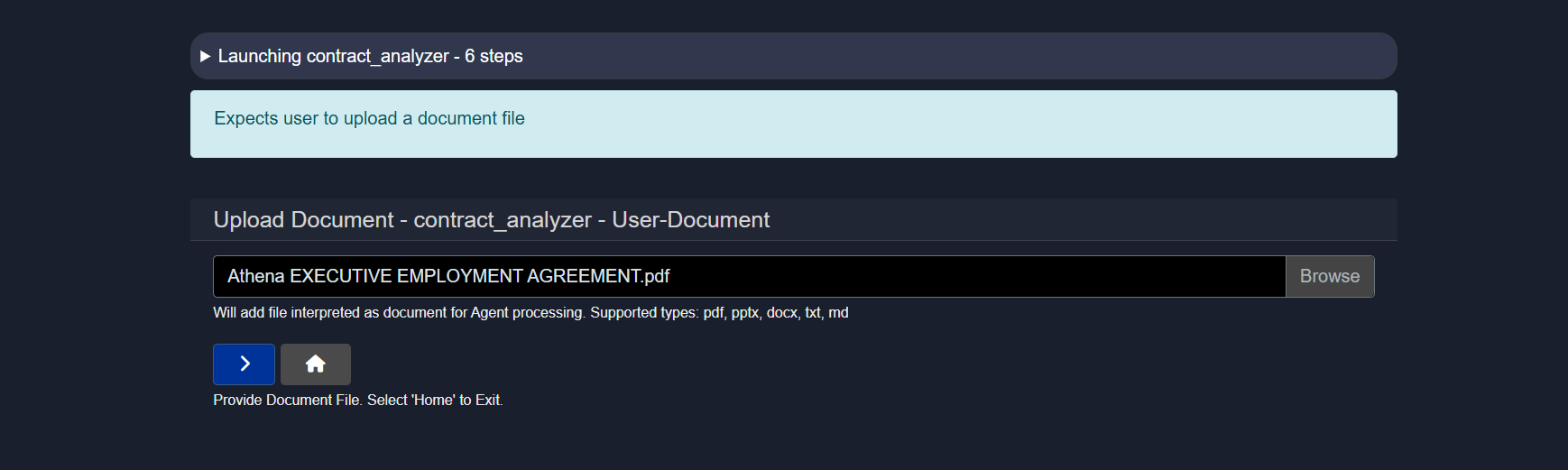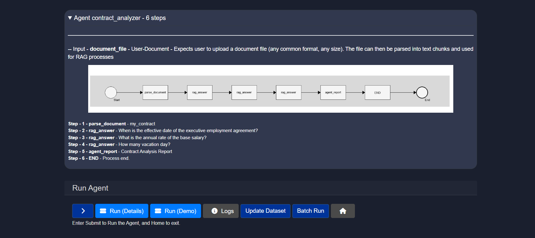 Step 1 - parse_document - my_contract Step 2 - rag_answer - When is the effective date of the executive employment agreement? Step 3 - rag_answer - What is the annual rate of the base salary? Step 4 - rag_answer - How many vacation day? Step 5 - agent_report - Contract Analysis Report Step 6 - END - Process end.Uploading a File as Input