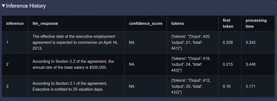 The Inference History table provides detailed logs of each inference performed by the language model, enabling transparency, performance tracking, and auditing. This is particularly useful for AI-driven processes such as contract analysis, customer support, and research workflows.