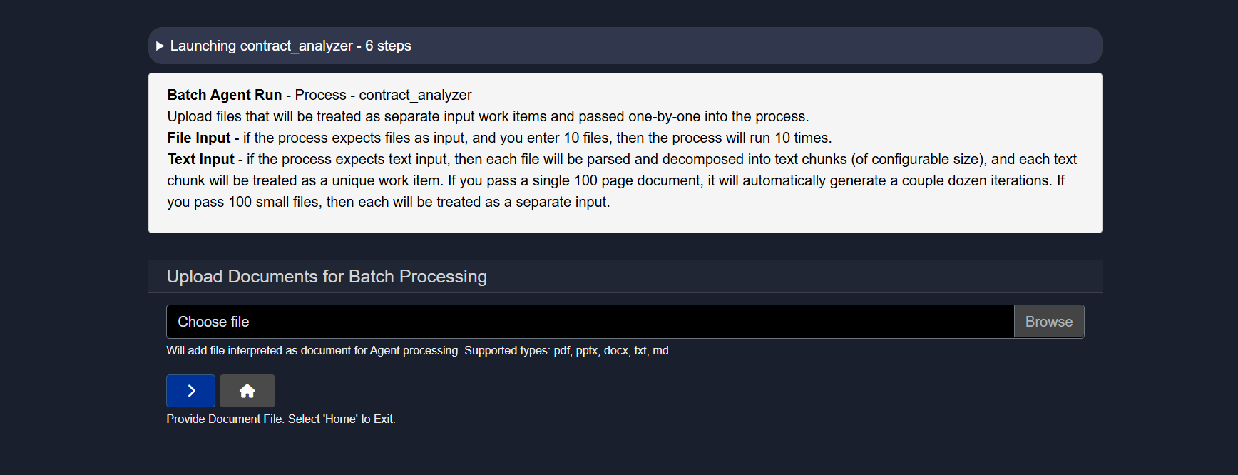 In the selected agent (Contract Analyzer), a file is required as input. Since it is a contract analyzer agent, a contract document is needed for analysis. The complete breakdown of all steps for this agent is as follows: