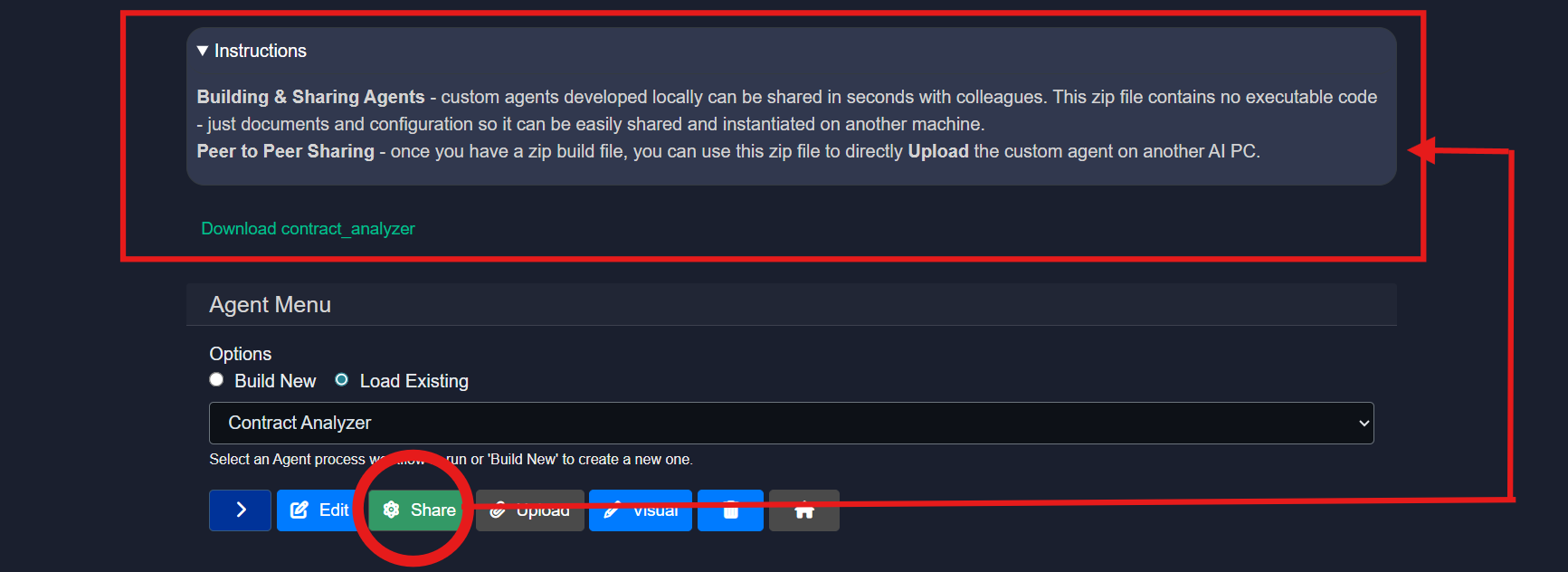 The Share option in the agents interface allows an agent to be downloaded for sharing purposes.