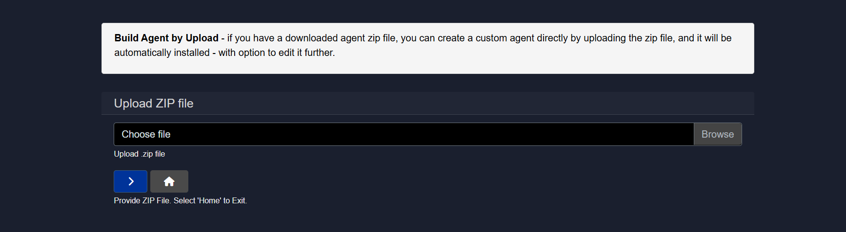 If a downloaded agent zip file is available, a custom agent can be created directly by uploading the zip file, and it will be automatically installed in the list of available agents with the option to edit it further.