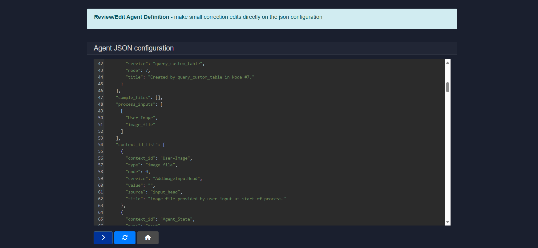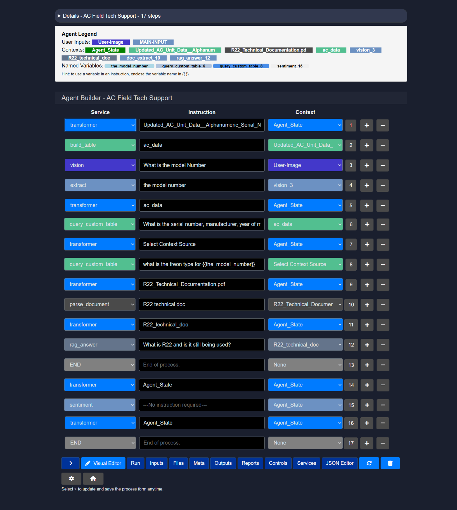 This view shows the full structure of the agent, including services, nodes, inputs, contexts, and execution settings, allowing precise inspection and modification of how the workflow is defined.