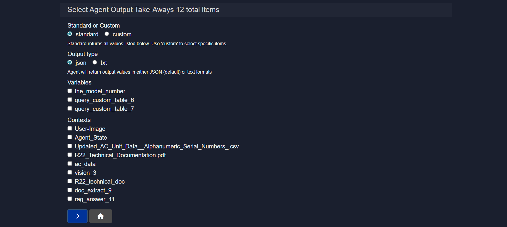 Selecting the correct inputs is critical. The user must provide values for all selected input types when running the agent. By default, MAIN-INPUT (text) is enabled.