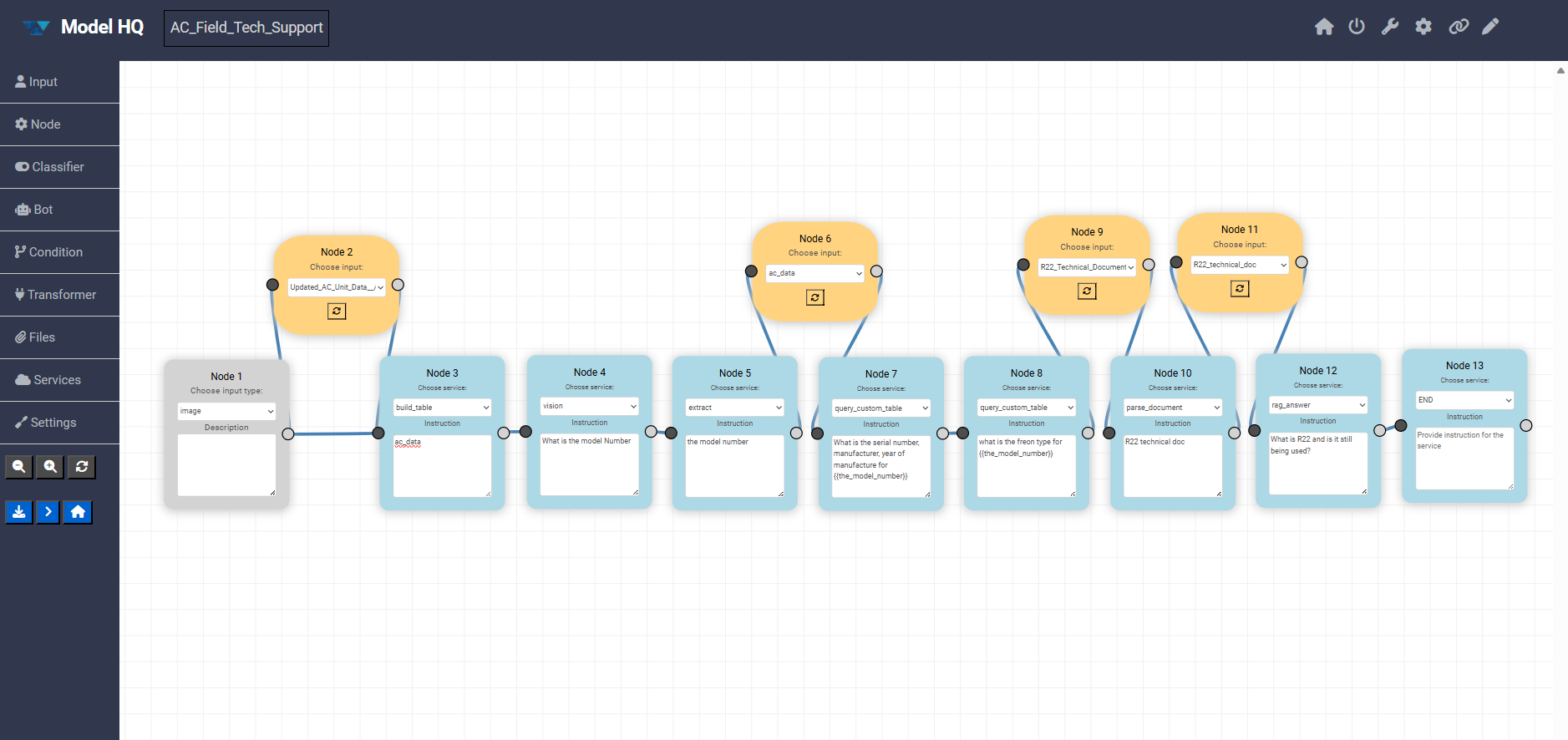 - Nodes can be selected to edit their instructions and configuration