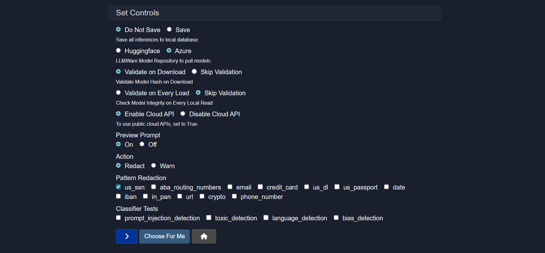 The Controls section defines global governance, security, validation, and safety behaviors for model execution and inference. These settings influence how models are loaded, validated, executed, and how sensitive data is handled across the platform.