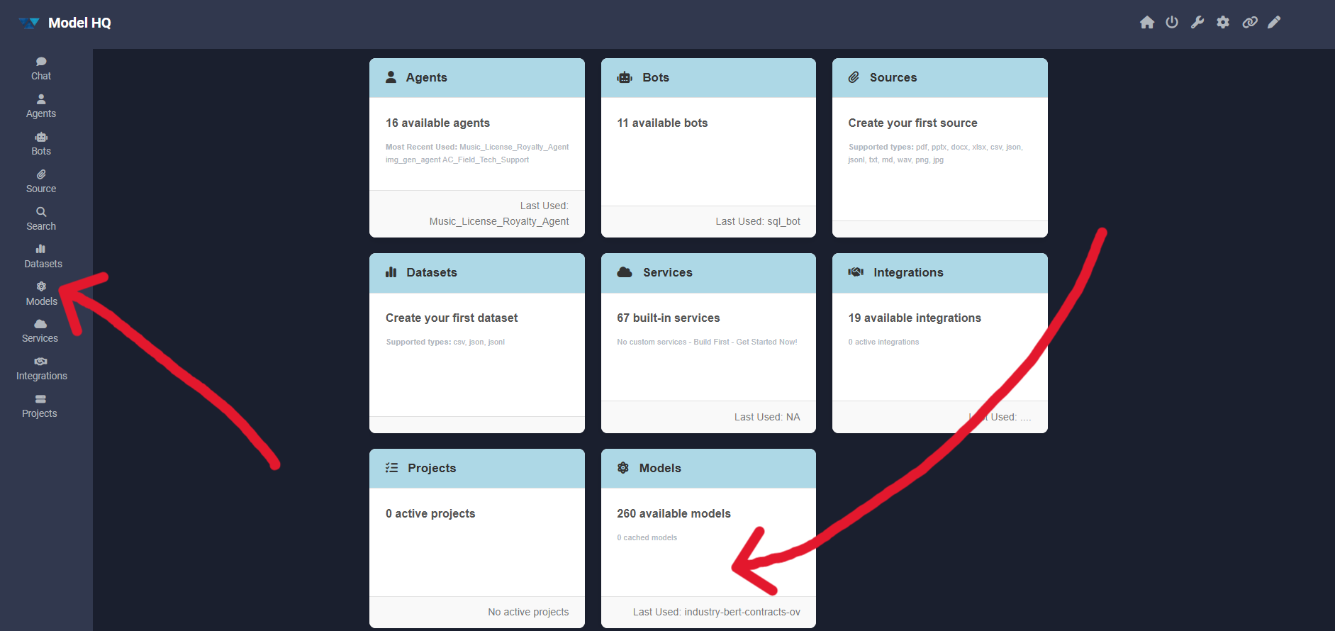 To begin, the Models button can be selected from the main menu sidebar or the first screen interface. The card on the main menu displays the total number of models that are available as well as provide the number of models that are cached and already downloaded on the user's device.