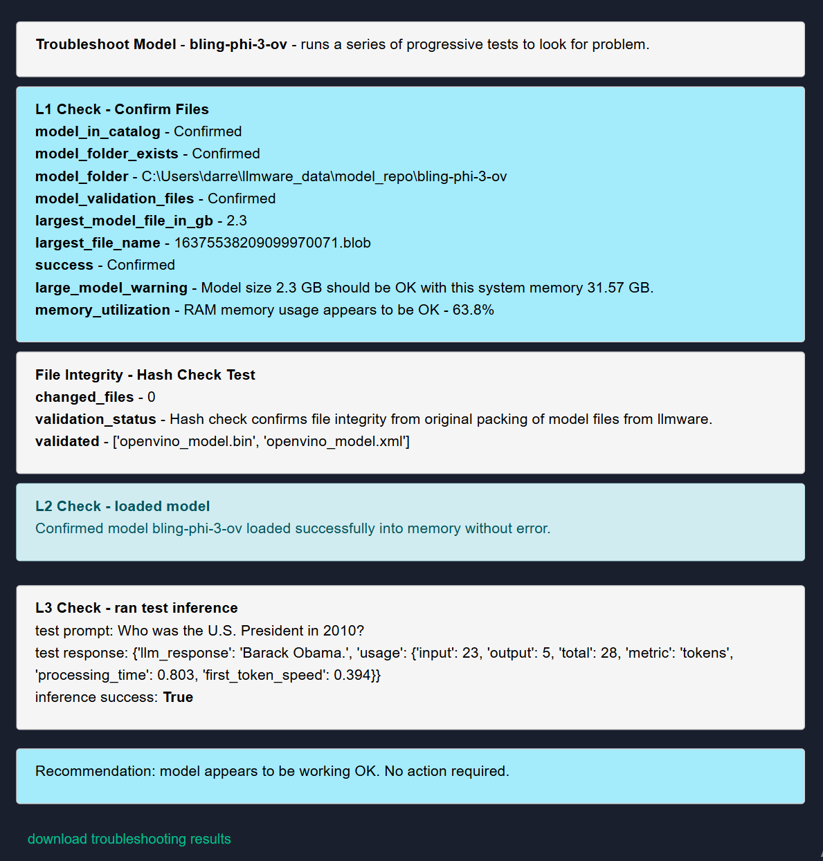The Troubleshoot function provides diagnostic tools and guidance for resolving model-related issues.