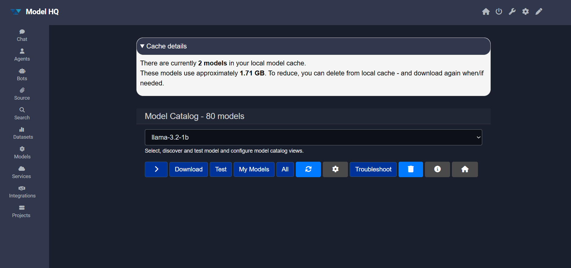 The Models interface in Model HQ provides comprehensive tools for discovering, managing, and validating models. Users can explore the full catalog, download models for local use, run tests to validate performance, and configure model selection preferences to optimize for their specific use cases.